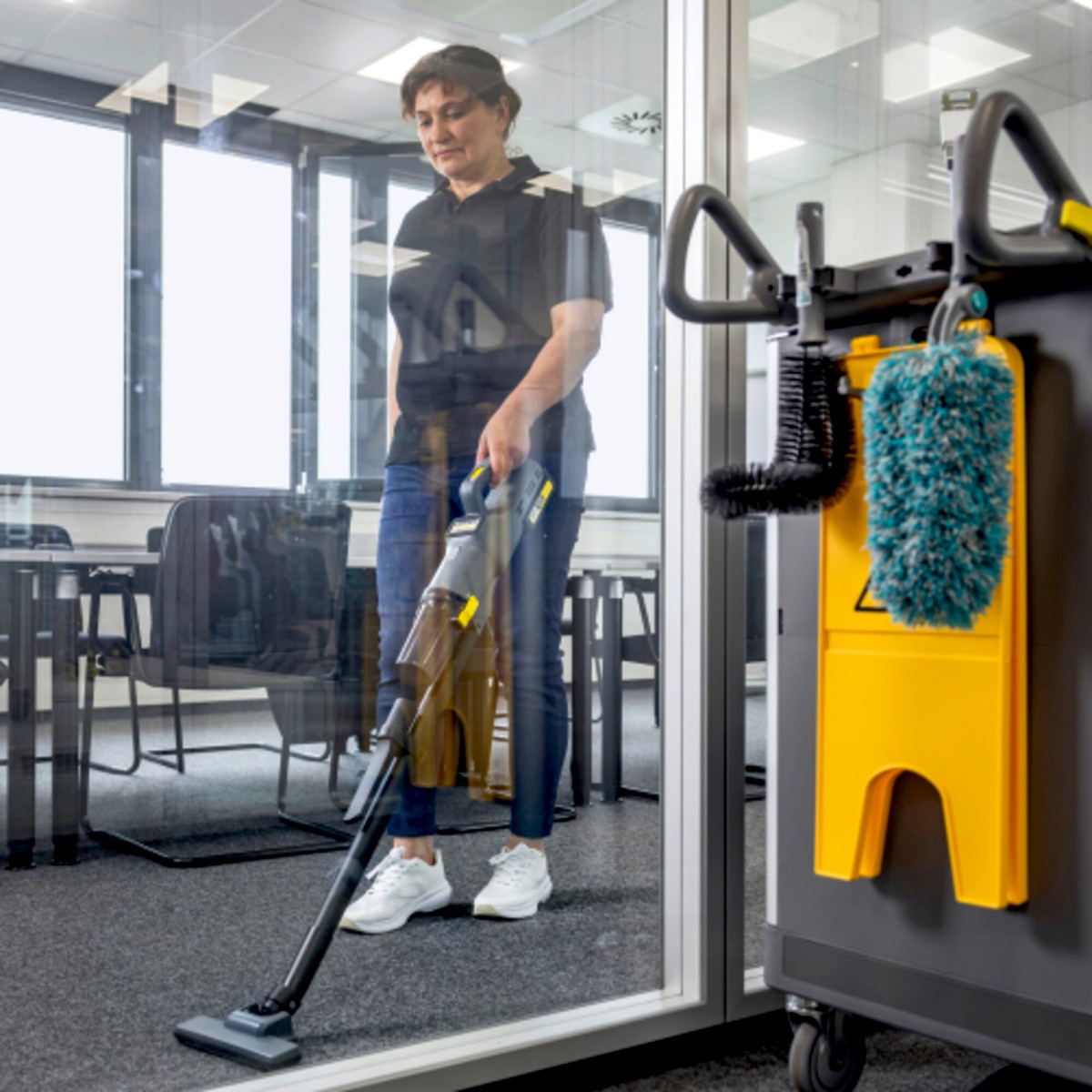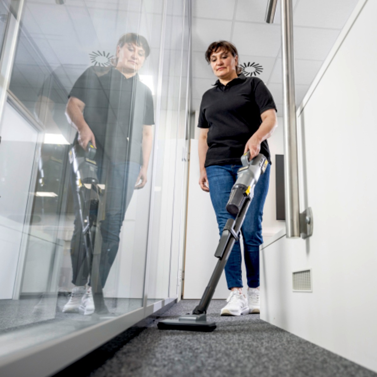 The robust LVS 1/1 Bp battery-powered dry vacuum cleaner offers excellent suction power and effectively removes dust and dirt. The Kärcher cyclone filter technology keeps suction power consistently high. Cordless, compact and manoeuvrable, the vacuum cleaner is ideal for spot cleaning in the hotel, catering, retail and building cleaning sectors. Thanks to its unrestricted freedom of movement, it is also perfect for cleaning stairs. The integrated HEPA 13 filter ensures the highest standards of hygiene. The suction power can be adjusted in three stages, and in just a few simple steps, the cylinder vacuum cleaner becomes a handheld vacuum cleaner for upholstery and various other surfaces. The waste container does not require any filter bags, saves costs and is sustainable. It can be emptied quickly and hygienically – without coming into direct contact with dirt. With the powerful Kärcher 18-volt rechargeable batteries, the vacuum cleaner achieves excellent cleaning results. A practical bracket ensures that the supplied crevice nozzle is always ready to hand. Note: the battery and quick charger are not included in the scope of supply and must be ordered separately. A large selection of nozzles and accessories (DN 35) can be ordered as optional extras.